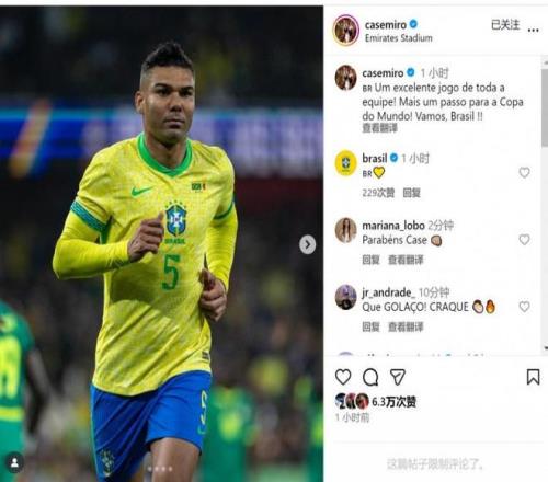卡塞米羅社媒曬出比賽照片,寫道:“全隊都表現(xiàn)出色,向世界杯又邁進(jìn)一步!加油巴西!”