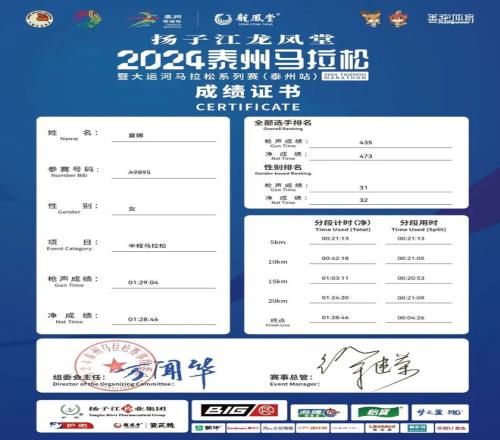 兩年后,她在泗洪馬拉松上成功破三,以2:58:24完賽。